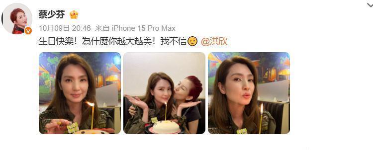 照片中洪欣穿着墨绿色衬衫,染了亚麻棕的发色,整个人看起来非常年轻。而蔡少芬则是染了一头红发亲昵的对洪欣做出亲亲的动作。